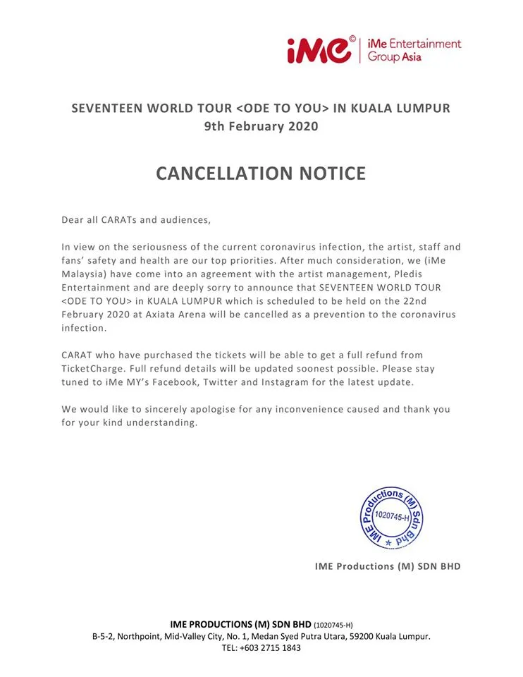 SEVENTEEN’s world tour “Ode To You” Live in Malaysia was supposed to take place at Axiata Arena next weekend on 22nd February 2020. There’s no question that people’s safety and health have to take precedence. iMe Malaysia has also announced that all K-pop fans will be able to get a full refund from TicketCharge. Full refund details are expected to be released sometimes this week.