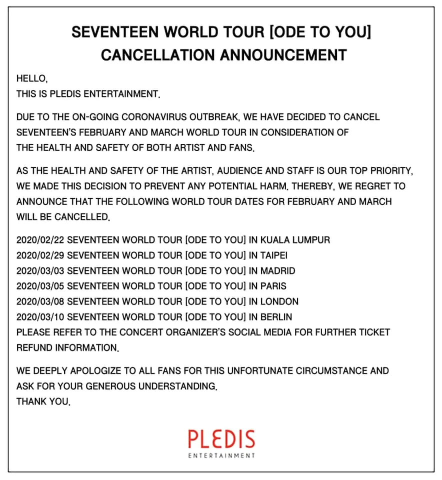 This announcement was made via Pledis Entertainment and iMe Malaysia over the weekend. In light of the coronavirus epidemic, the label is not willing to put anyone at risk of infection.