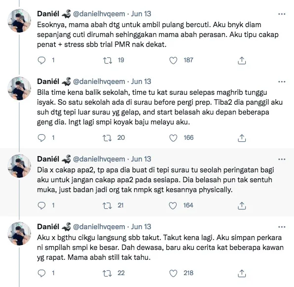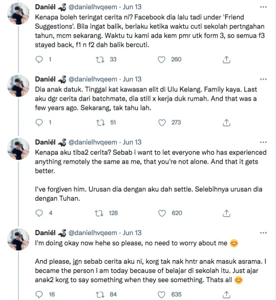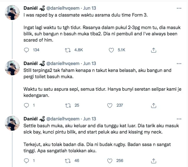 Recently, a Malaysian guy named Daniel Haqeem took to his Twitter account to share a dark experience he encountered with a former classmate of him when he was a Form 3 student.