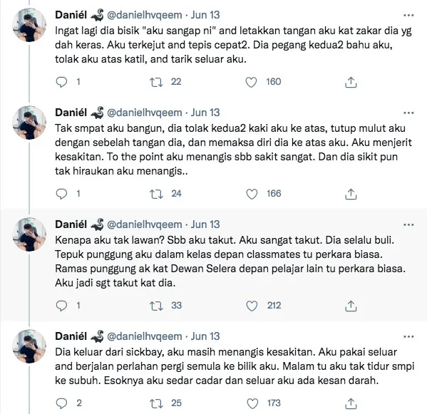 “After we returned back to school, we were waiting for the Isyak prayer to commence. Everyone was heading to the surau before prep time. Suddenly, he called me out and brought me to a dark alley outside the surau, and started beating me in front of his gang members. He didn’t say anything, but he was probably threatening me not to say anything to anyone,” Daniel tweeted.
