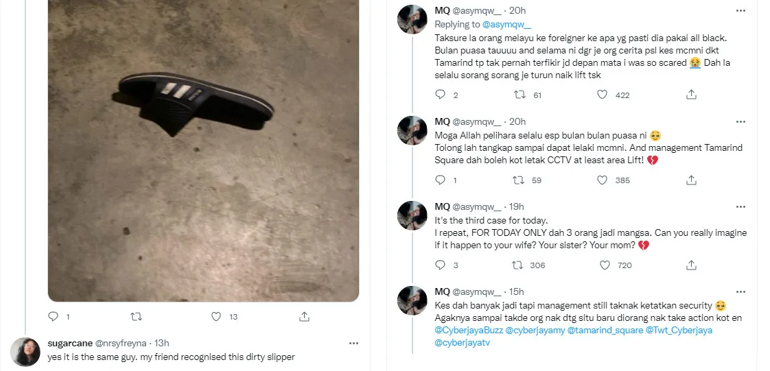 “Not sure if it’s good news or not, one side of the guy’s slipper came lose. Maybe he got shocked and ran when people heard her (the lady’s) screams,” MQ said, posting a photo of the slipper. Sugarcane later confirmed that the cases were connected as her friend recognised the slipper. “It’s the third case for today,” MQ noted. “There’s been plenty of cases but the management still doesn’t want to enhance security.” Sugarcane added that according to the police, Tamarind’s management have remained mum about the issue.