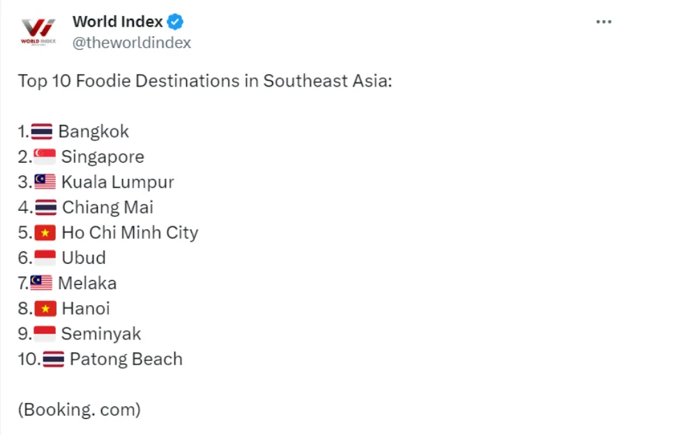 World Index recently shared the list of ‘Top 10 Foodie Destinations in Southeast Asia’ on their Twitter page. In the list, Bangkok, Singapore and Kuala Lumpur take the top three spots, respectively. The only other Malaysian city on the list is Melaka, which placed seventh. While many Malaysians were happy about two local cities placing in the Top 10 list, many couldn’t help but poke fun at Singapore’s “questionable” second spot placement.