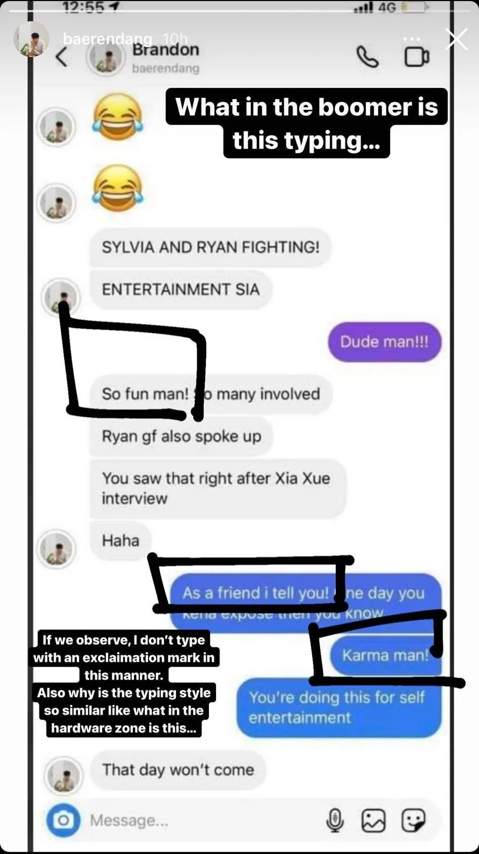 When the friend warned him about karma potentially coming back to bite him in the butt, the account claiming to be Baerendang allegedly said, “that day won’t come”. However, Brandon is insisting he doesn’t “type with an exclamation mark in this manner” while asking a rhetorical question, “what in the boomer is this typing…”