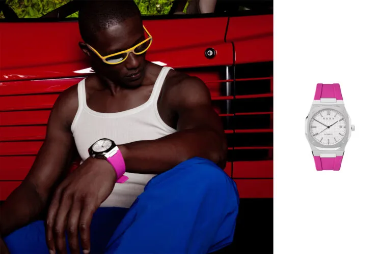 The design of these watches often comes down to both an aesthetic decision and a functional one, as in Aura’s industry-first offering of in-house, interchangeable FKM rubber straps in a variety of on-trend colours.