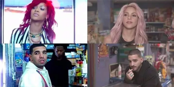 The side by side comparison above was uploaded on the Rihanna Colombia Facebook fan page account. Shakira’s “Chantaje” opens with her walking flirtatiously into a convenience store and sees Maluma leaning towards the counter. Upon locking eyes, the Colombian rapper starts to follow Shakira around the store. After cornering her against a refrigerator, the couple starts to get physical.