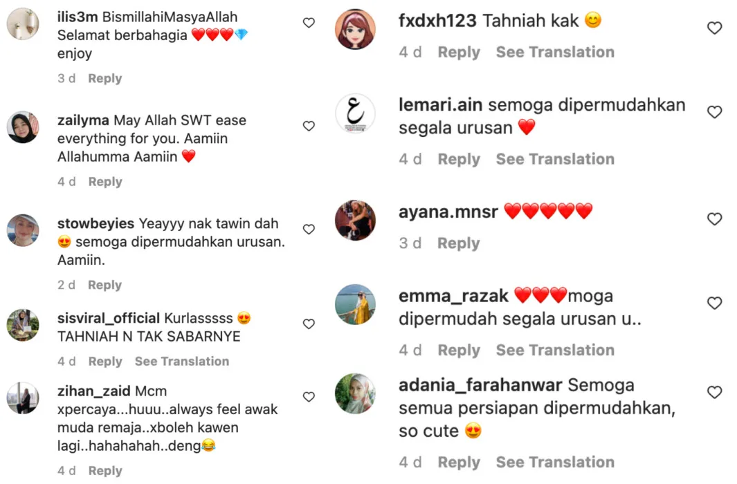 The netizens wrote, “Hopefully everything will run smoothly,” “Be happy and enjoy,” “I’m happy for you,” and “Congratulations and I cannot wait (for the wedding)!“. A netizen also commented that he could not believe the two-time Malaysia Film Festival Best Actress winner is getting married soon as he feels like the actress is still a teenager.
