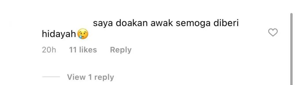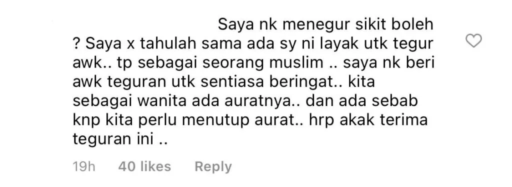 A user commented, “I pray that God will give you guidance “. While another user proceeded to type a whole paragraph of comment, “allow me to advice you, although I might not be in the place to do so but as a fellow Muslim, I hope you remember that we, women, must always cover up and there’s a reason for that. I hope you can accept this advice.” Another comment simply stated, “girls nowadays do not have shame.“