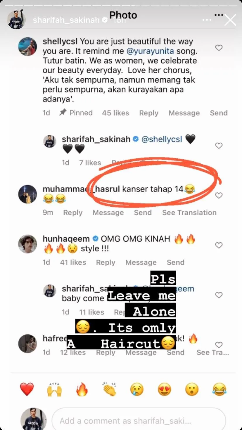 That being said, it appears that not everyone is a fan of the “Girlfriend Aku Dari Neraka” star’s dramatic transformation. One particular Instagram user named Muhammad Hasrul even went as far as to compare her new hairdo to a Stage 4 cancer patient! Of course, Sakinah, being the outspoken person herself, refused to stay silent. She pleaded to the netizen, saying, “Please leave me alone. It’s only a haircut. 😔”