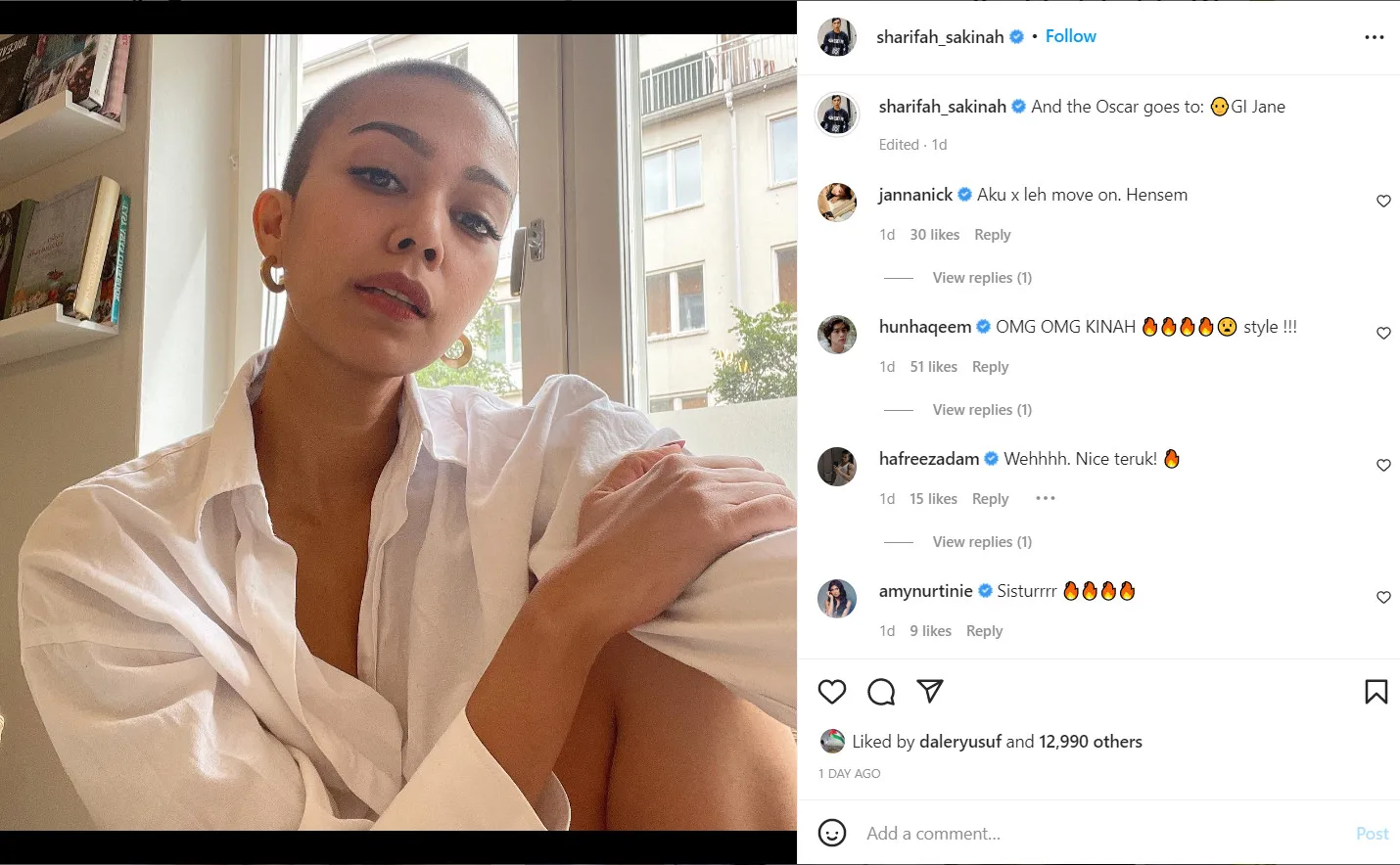In the photo, Sakinah was seen donning a piece of basic white shirt, along with a pair of earrings to complement her minimalist look. “And the Oscar goes to…’G.I Jane'”, Sakinah cheekily captioned her post.