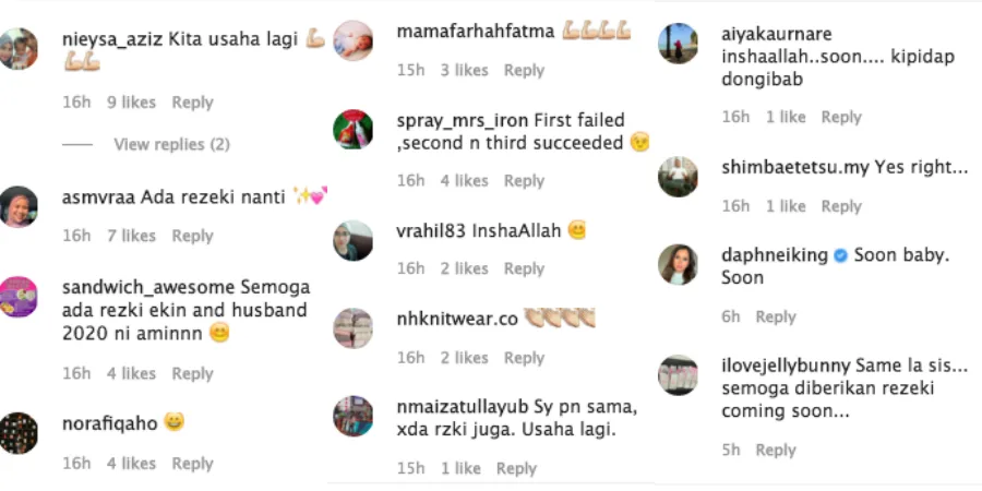 Scrolling through the comments section, most of Sakinah’s followers have been leaving uplifting remarks towards her attempt in getting her 2nd baby. In this case, the 31-year-old has been showered with words of encouragement by her fans. They even asked her to be patient and take a break from trying.