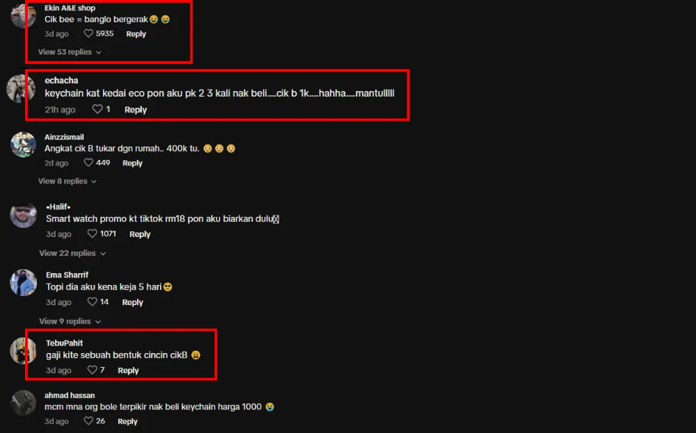 The cost of the outfit dropped jaws, especially the extravagant price tag of the watch, which Cik B did not specify the brand. One netizen even called her a walking bungalow house given the cost of her outfit, while another said her ring is the equivalent of their monthly salary. Many netizens also joked that they could never spend like Cik B, saying they would think twice about buying a keychain from a two-ringgit shop, let alone one that costs RM1,000.