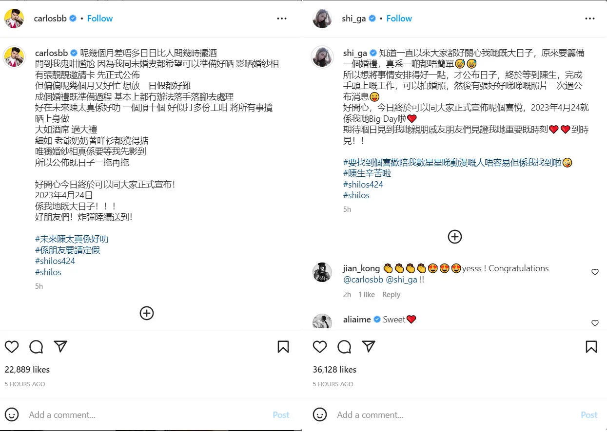 Hong Kong artists Carlos Chan (陈家乐) and Shiga Lin (连诗雅) revealed mid last year that they were officially engaged. However, since then, there has been little to no news about their wedding. Well, wait no longer, Carlos and Shiga have finally revealed their wedding date!