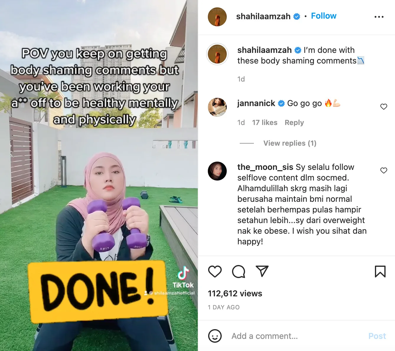 The video has since garnered positive comments from netizens who have been following Shila’s socials. Actress Janna Nick – who is no stranger to such attacks -has also commented in support of her on Instagram. “Go go go (flame emoji)“, she wrote.