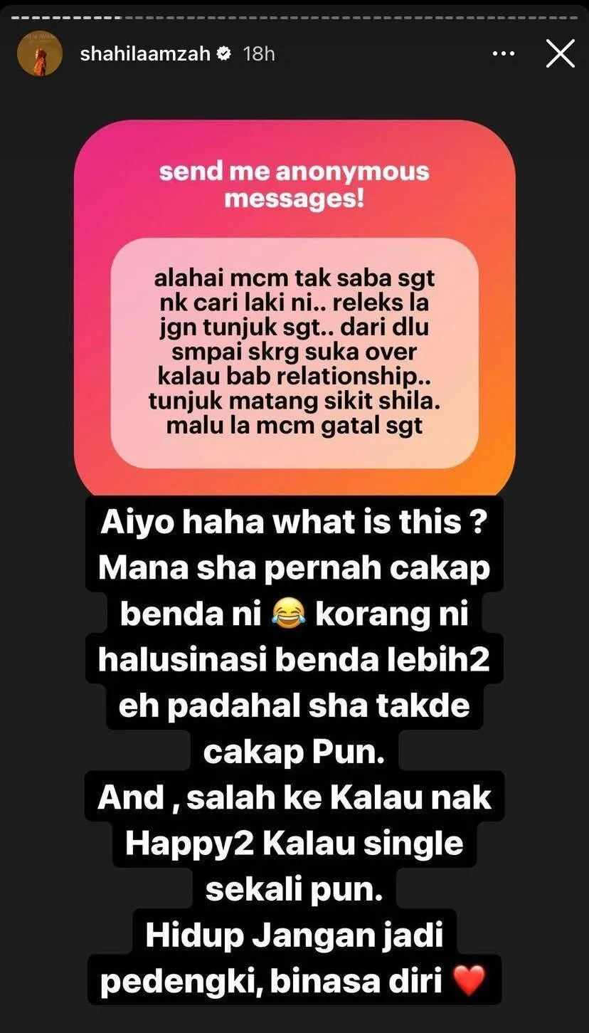 “It sure looks like you’re so eager to find yourself a man. Just relax, and don’t expose too much. You tend to always over share about your relationships. You haven’t changed so please be more mature, Shila. You’re embarrassing yourself, and you look like a pervert,” the IG user told Shila (full name Nurshahila Amir Hamzah).