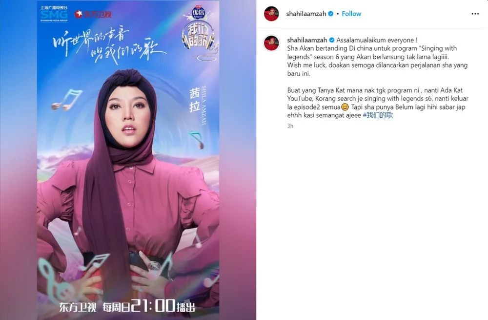 “Singing With Legends ((我们的歌)” is a competition that pairs renowned veteran singers with their juniors as they perform on the same stage. The sixth season features an impressive lineup of stars, including Hong Kong singer Leo Ku (古巨基) and Danish band Michael Learns To Rock. According to reports, Shila will join the program as part of Group E. The 34-year-old, whose real name is Nurshahila binti Amir Amzah, also clarified that her performance has yet to go on air but will be available on YouTube.