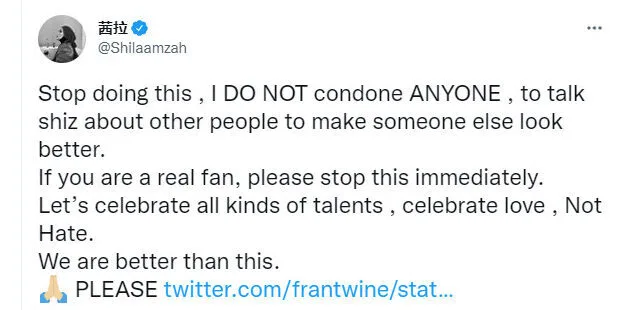 Needless to say, Shila (full name Nurshahila Amir Amzah) didn’t take too kindly to the fan’s opinion. “Stop doing this. I do not condone anyone (talking) shit about other people to make someone else look better. If you are a real fan, please stop this immediately. Let’s celebrate all kinds of talents, celebrate love, instead of hating on one another. We are better than this. 🙏🏼 Please,” the “Beribu Sesalan” singer responded on her Twitter.
