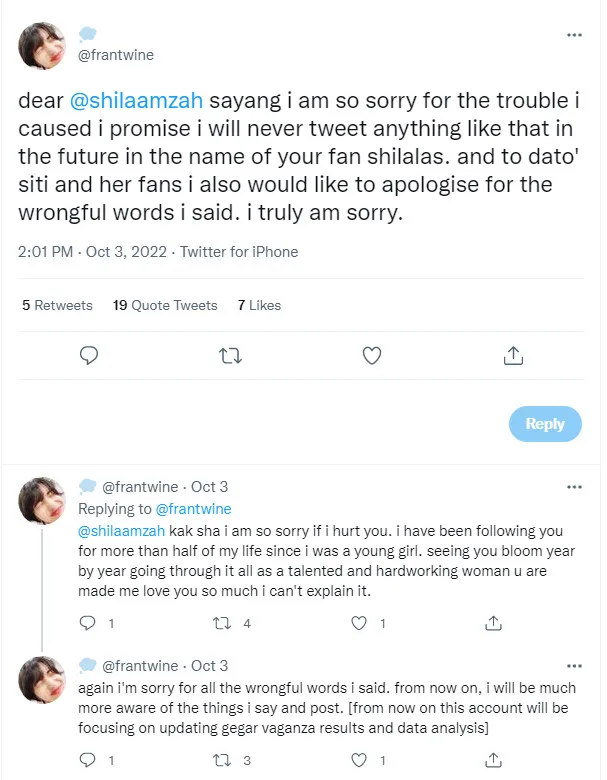 Following that, the fan in question once again took to her Twitter to issue a public apology. She wrote, “Dear @shilaamzah, I am so sorry for the trouble I caused. I promise I will never come up with posts like that in the future in the name of your fan-club Shilalas. And to Dato’ Siti and her fans, I also would like to apologise for the (hurtful) words I said. I am truly sorry. From now on, I will be more aware of the things I say and post.”