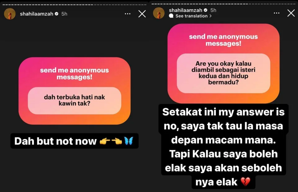 Next, someone also popped a question on whether she’s open to getting married again following her separation from her ex-husband. The “Yang Teristimewa” singer responded by revealing that she’s open to tying the knot again, but not in the near future. To quote Shila herself in her IG Story post, “Yes (I’m open to getting married again), but not now 👉👈🦋.”