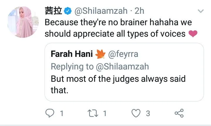 Singer Shila Amzah has brought herself some unwanted attention when she tweeted something about the recent episode of Astro’s talent show “Big Stage”.