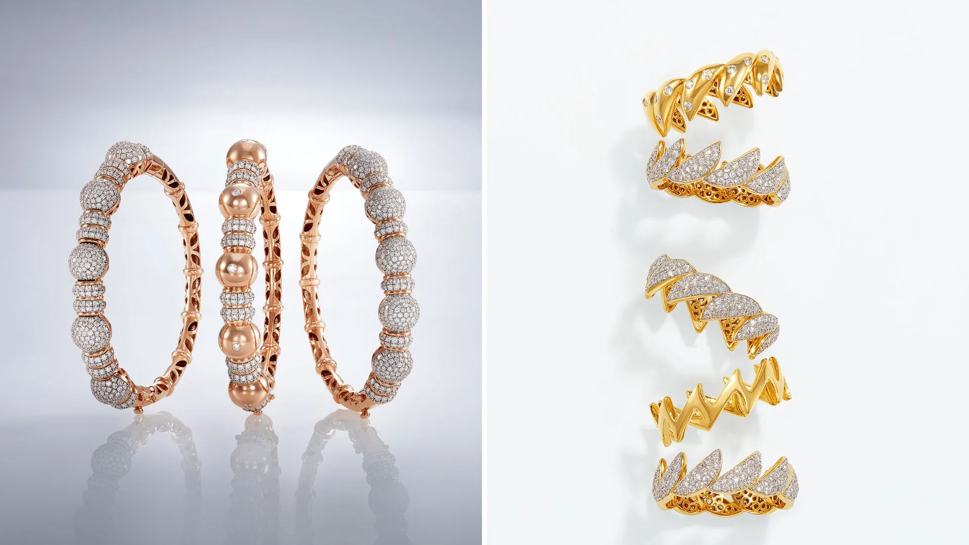One standout bangle set features alternating rose gold spheres – some shimmering with diamonds, others clean and high-shine. They catch the light with every movement, perfect for the modern woman who wants her jewellery to speak volumes without saying a word.