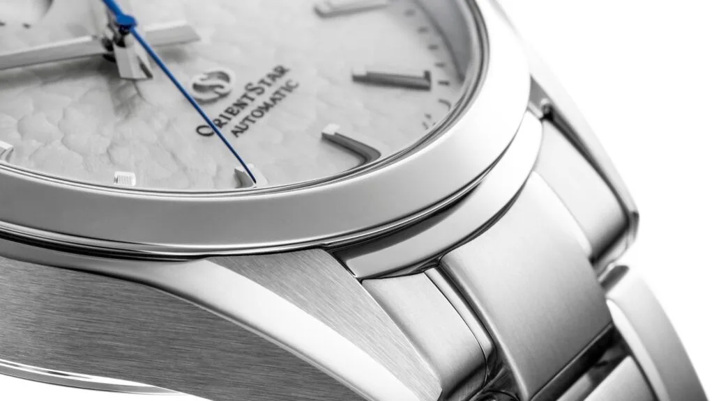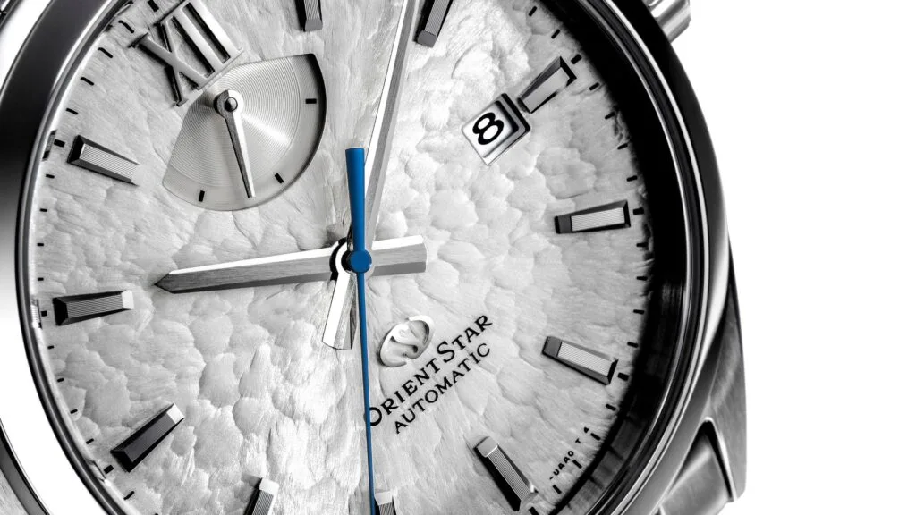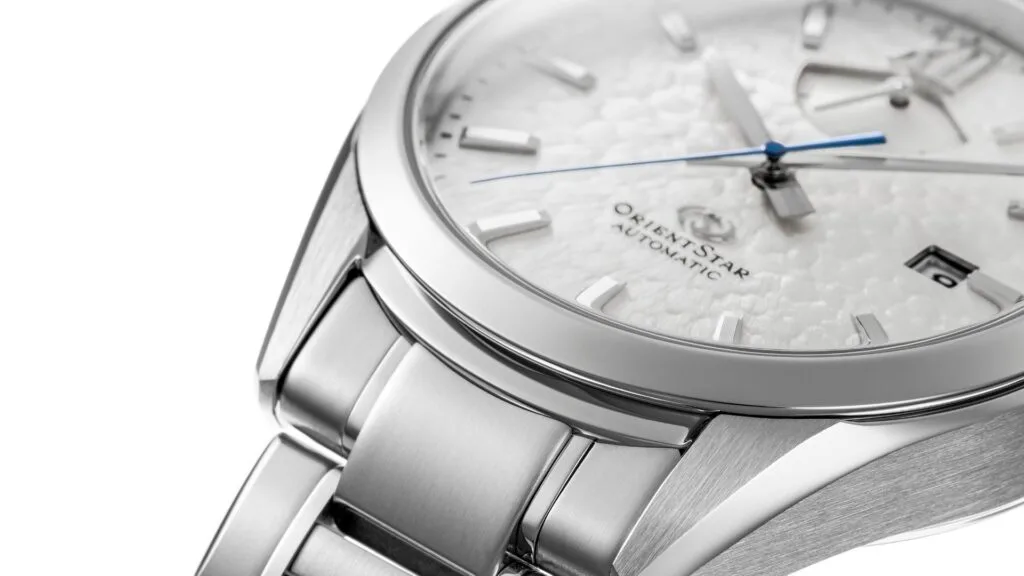 The M34 F8 Date’s dial features a traditional three-hand dial design consisting of hour, minute and centre seconds, along with a date display at 3 o’clock. Orient Star’s original power reserve indicators sit at 12 o’clock, while the dial also features a hand-carved pattern depicting Perseid meteor showers. The white dial model is as lustrous as a meteor showering down in the dawning sky, giving the impression of auspicious light. The dial on the regular model is further enhanced by the blue colour, which depicts the night sky.