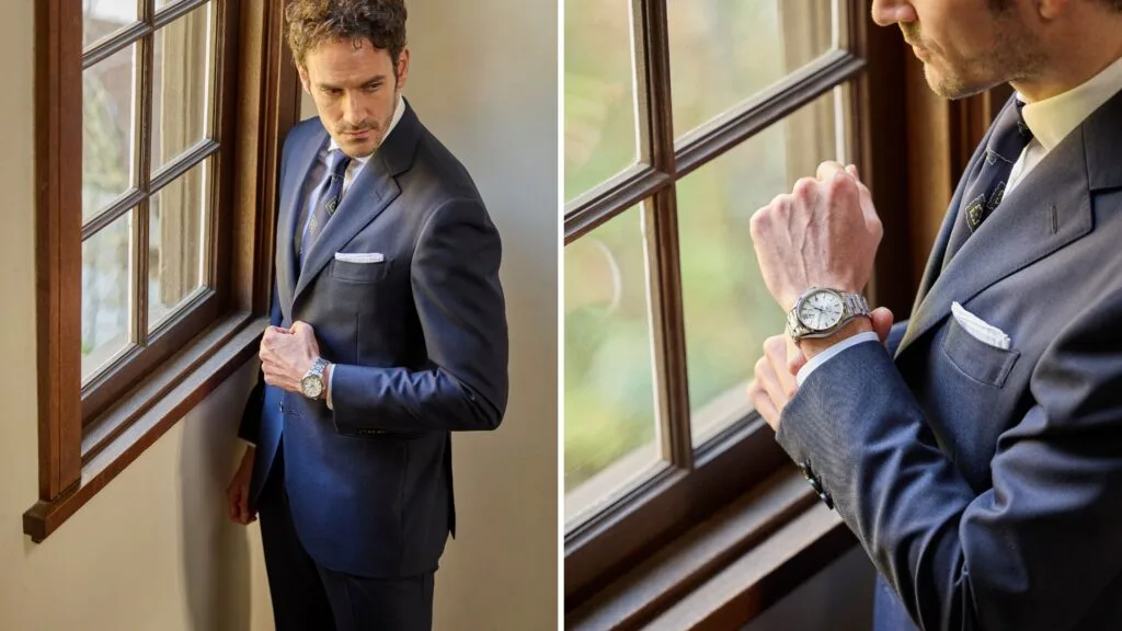 Furthermore, due to the dual curved sapphire crystal glass with an anti-reflective coating on both sides (SAR coating), the glossiness of the white dial and the intricate pattern on the blue dial can be clearly admired.