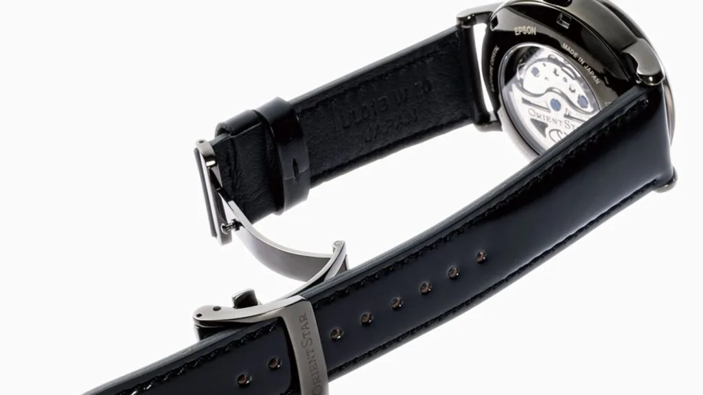 Like the dial colour, the M34 F8 Date’s new movement also features advanced technology. The automatic mechanical in-house calibre F8N64 is mounted with a silicon escape wheel, which has become one of Orient Star’s signature technologies since first making an appearance in the 2021 Skeleton model celebrating the brand’s 70th anniversary. It also offers high accuracy of +15 seconds to –5 seconds per day and a power reserve of 60 hours. The improved torque facilitates better movement of the long hands. The movement, particularly the rotor’s chamfered Geneva stripes, glimmers beautifully through the see-through sapphire crystal caseback.