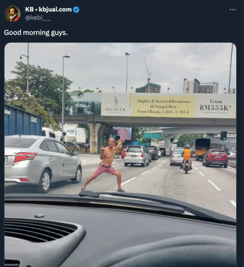 Yesterday (Tuesday, 12th December), a netizen who goes by @kebi___ posted a photo of a man in the middle of a road without a shirt on, giving the middle finger to someone in a very dramatic fighting-style pose. “Good morning, guys,” the caption reads. Sadly, there was no other explanation as to what exactly happened in the photo posted above.