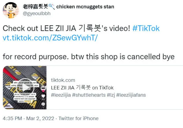Additionally, the seller attempted to promote their product on TikTok. Unfortunately, it only drew netizens ire as many felt they were infringing on Zii Jia’s copyright. Several scolded the seller saying they were taking advantage of the player. Others urged fans to buy the “original products” and avoid supporting the seller. The video was also spread to Twitter where some users openly claimed they would be boycotting the seller.