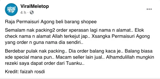 A local online seller recently shared a story about receiving an order from Raja Permaisuri Agong, Tunku Hajah Azizah Aminah Maimunah Iskandariah (yup, you read it right), on the Shopee app – and her reaction was 100% relatable!