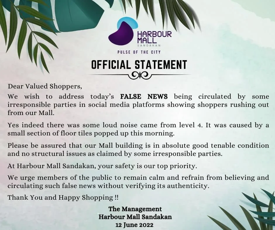 “Please be assured that our Mall building is in absolute good tenable condition and no structural issues as claimed by irresponsible parties,” the management said in their statement on Harbour Mall Sandakan’s official Facebook page. Following the statement, the management released several photos of the cracked tiles.