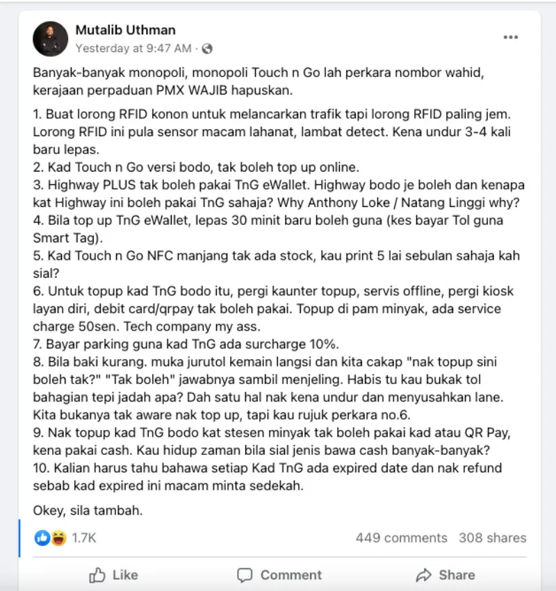 Recently, Mutalib Uthman took to Facebook to express his frustration over the Touch ‘n Go monopoly. In the lengthy post, he urged the government to abolish it saying, “Out of all the monopolies out there, the Touch ‘n Go monopoly should be the first thing the government should eliminate”. The MUDA political party member listed down 10 reasons why the system should no longer be used in Malaysia. In his words, he said: