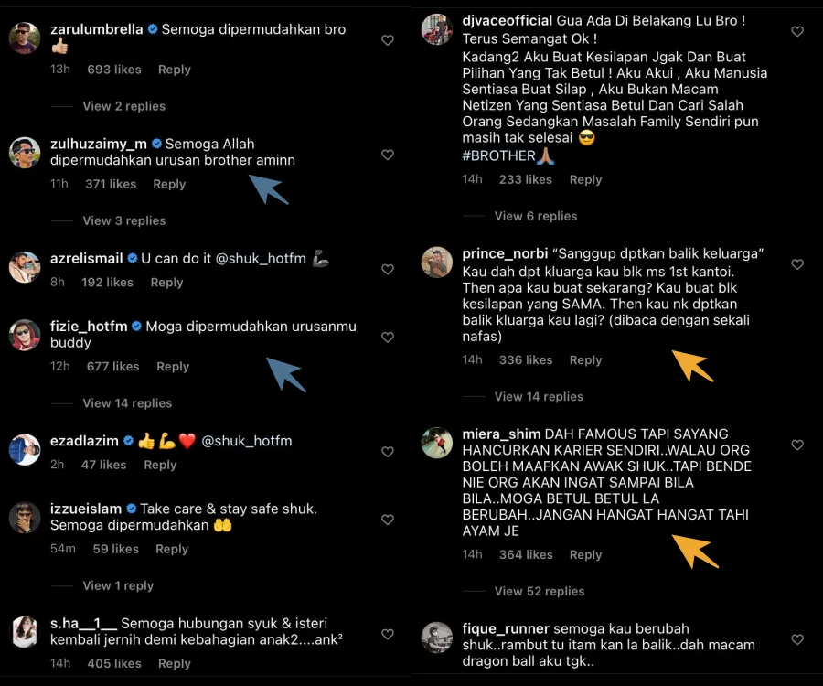 The post was met with various remarks left by Shuk’s celeb friends as well as fellow social media users. Some begged for Shuk to reflect and learn from his mistakes. Others also left uplifting remarks and prayed that all matters will be eased.