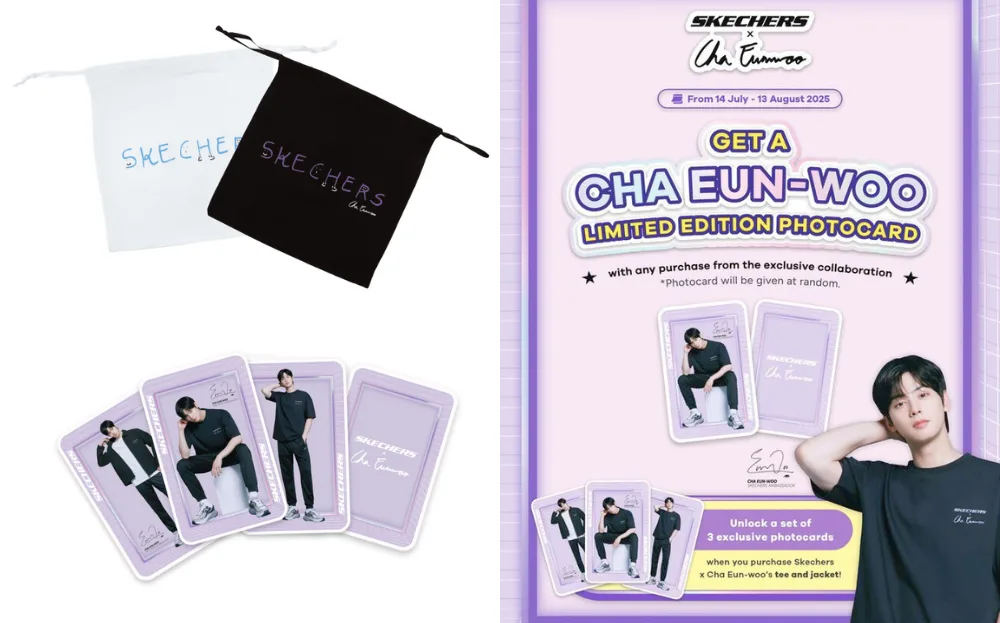 But that’s not all! For a limited time, fans who purchase both the T-shirt and jacket will also receive a complete set of exclusive Cha Eun-woo photocards. And for those who collect the full set, a purple hardcover sleeve stamped with the Skechers x Cha Eun-woo logo awaits, adding the perfect finishing touch to this emotional, unforgettable collection.