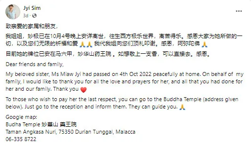 On 9th October, her younger sister, Sim Ler announced heart-breaking news. “Dear friends and family, my beloved sister, Ms Miaw Jyi had passed on 4th Oct 2022 peacefully at home,” Sim Ler wrote. “On behalf of my family, I would like to thank you for all the love and prayers, and all that you have done for her and our family. Thank you.”