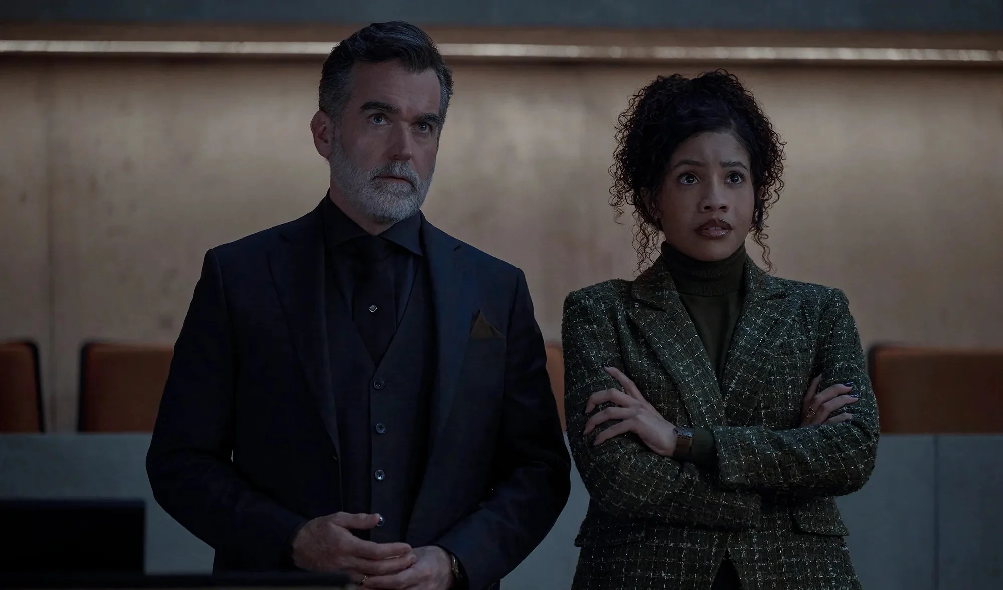 Melissa Barrera stars opposite Liu as Michelle, a key figure in Alexander’s life whose intentions are never entirely clear. The cast also includes Sinclair Daniel, Brian d’Arcy James, Mark O’Brien, and Kathleen Chalfant, all of whom add weight to a story that thrives on uncertainty and shifting alliances.
