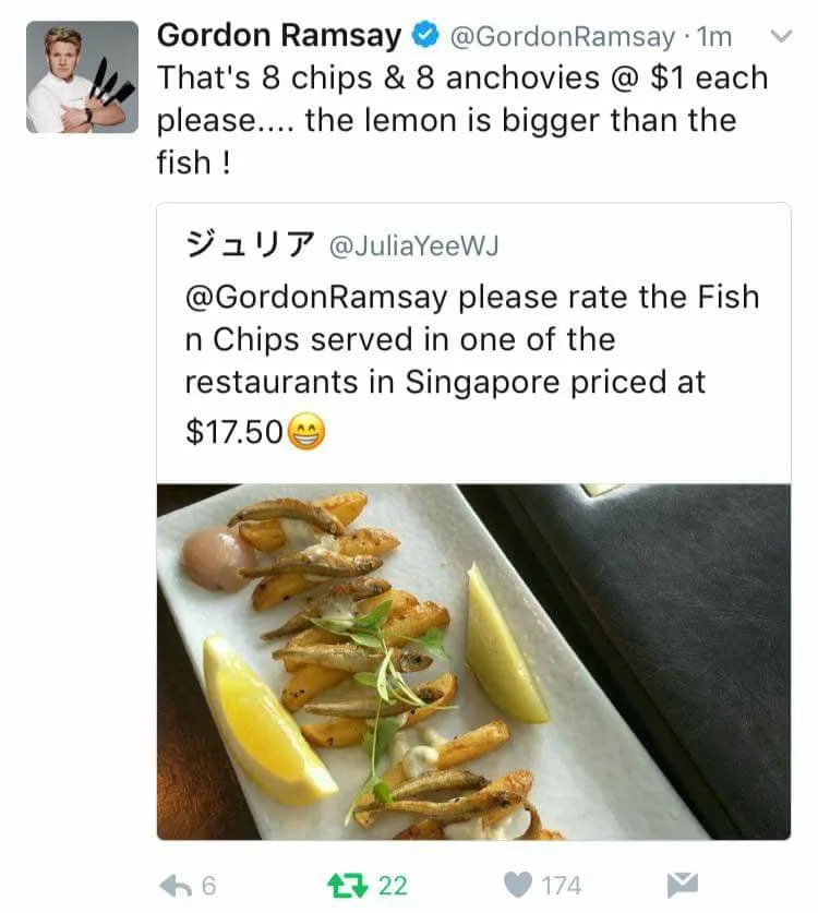 It was also tweeted to foul-mouth chef Gordon Ramsay, who saw the tweet and retweeted it with his own message. He wrote, “That’s 8 chips & 8 anchovies @ $1 each please…. the lemon is bigger than the fish!”