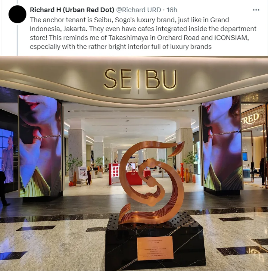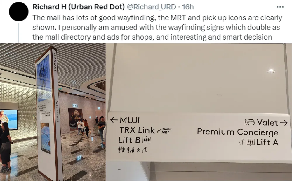 In his Twitter thread, Richard also praised The Exchange TRX’s MRT connectivity, saying the connection passageway is “wide and not too long, unlike (at) Suria KLCC”. He also commended the wayfinding in the mall, thanks to the clear icons and signage. However, he found the wayfinding signs doubling as directories and ads for tenants like MUJI and Seibu amusing. As for tenants, Richard highlighted The Exchange TRX’s anchor tenant, Seibu, saying the store’s bright interior reminded him of Singapore’s Takashimaya Shopping Centre and Bangkok’s ICONSIAM.