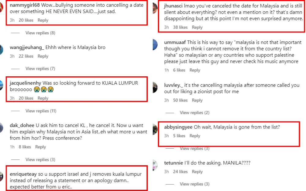 The “like” had many fans believing the singer was also pro-Israel, which led to a major backlash by Malaysians, who are majority pro-Palestine. Eric’s agency, EN Management, did not comment on the backlash even after releasing an updated list of stops for the ‘House On A Hill’ tour. Now, Malaysia is nowhere on the list.