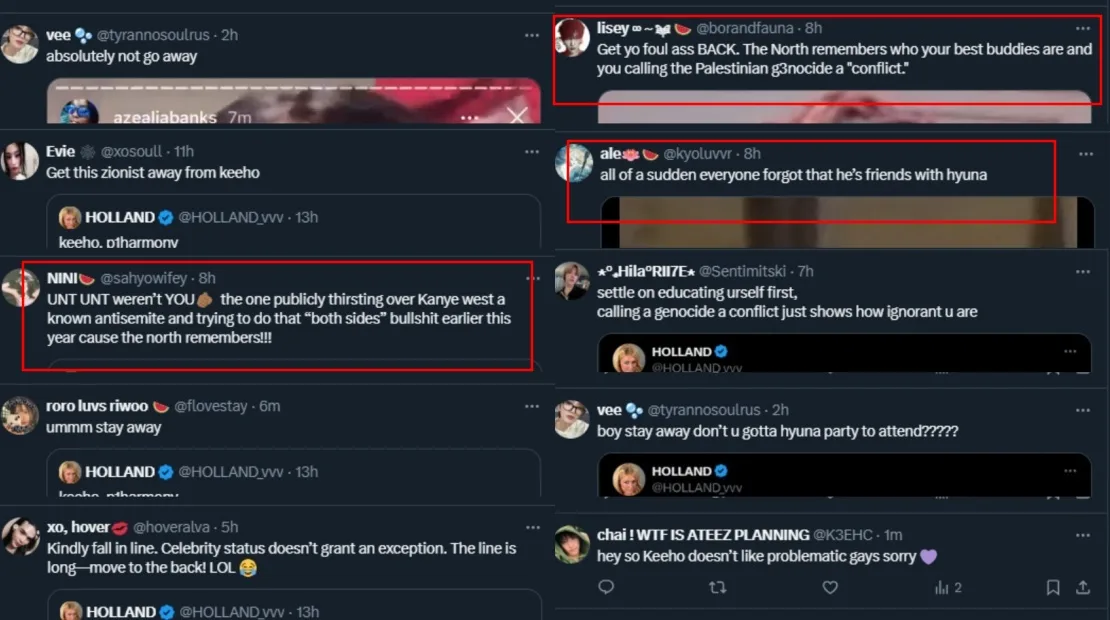 Scrolling through the replies and quotes, many warned the 28-year-old to back off from having a crush on Keeho (기호). Others recalled the time the queer celebrity remained neutral regarding the genocide in Palestine. A few even pointed out that he is still friends with soloist Hyuna (현아), who has faced significant backlash due to her relationship with former HIGHLIGHT/BEAST (하이라이트/비스트) member Yong Junhyung (용준형).