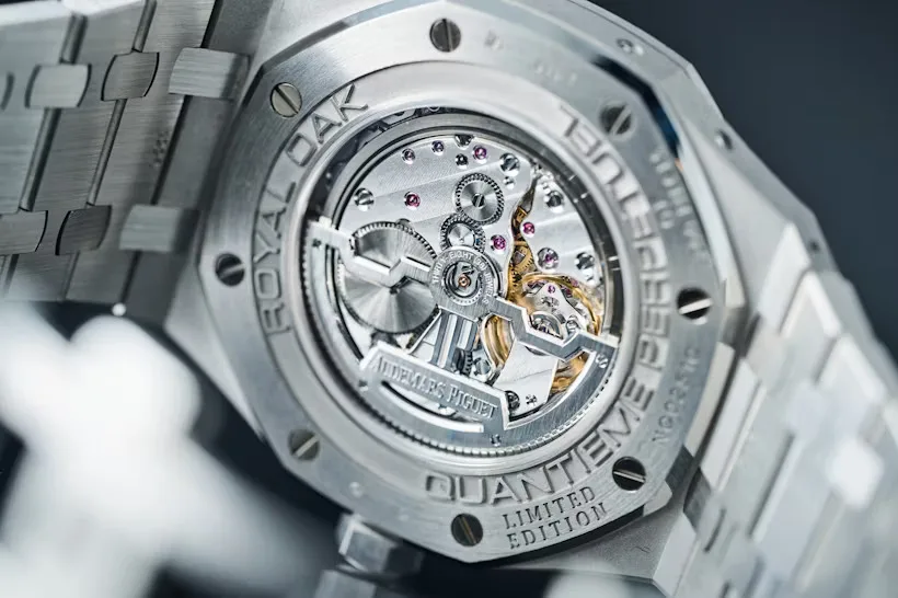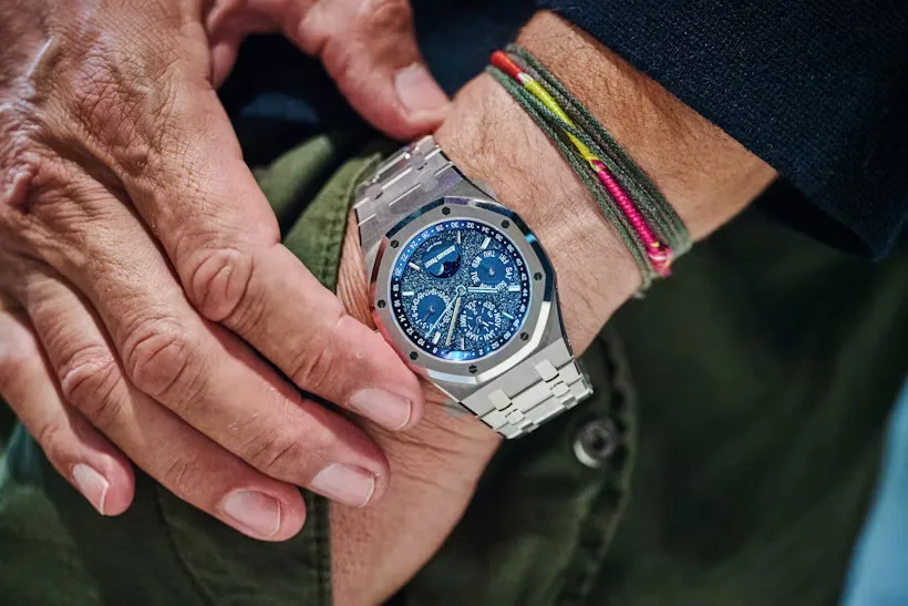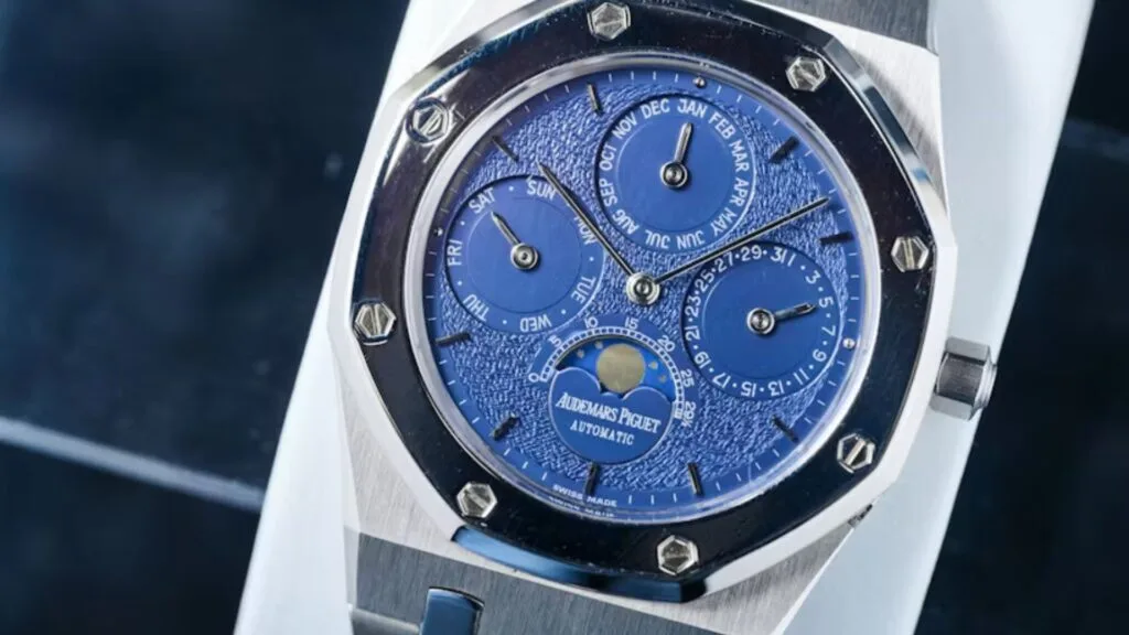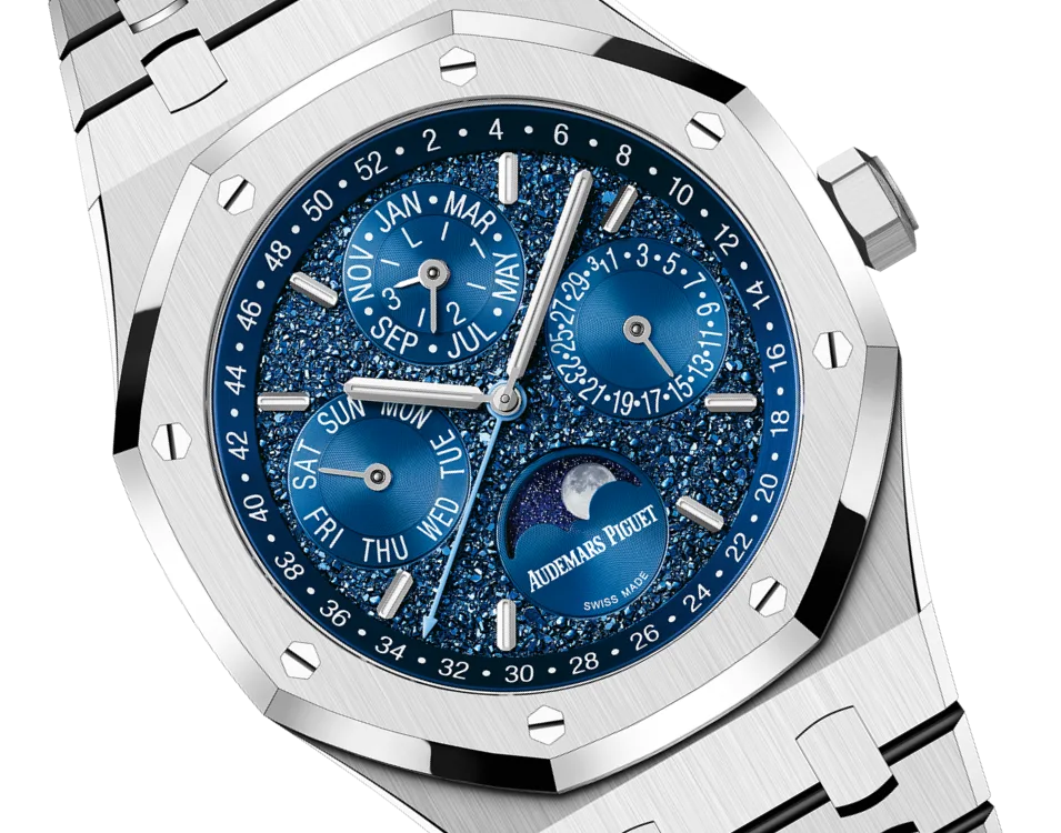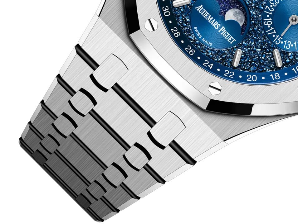 The Royal Oak Perpetual Calendar collaboration watch features the classic octagonal shape and is composed of 200 pieces, including white gold details that can be found across the body and the strap.