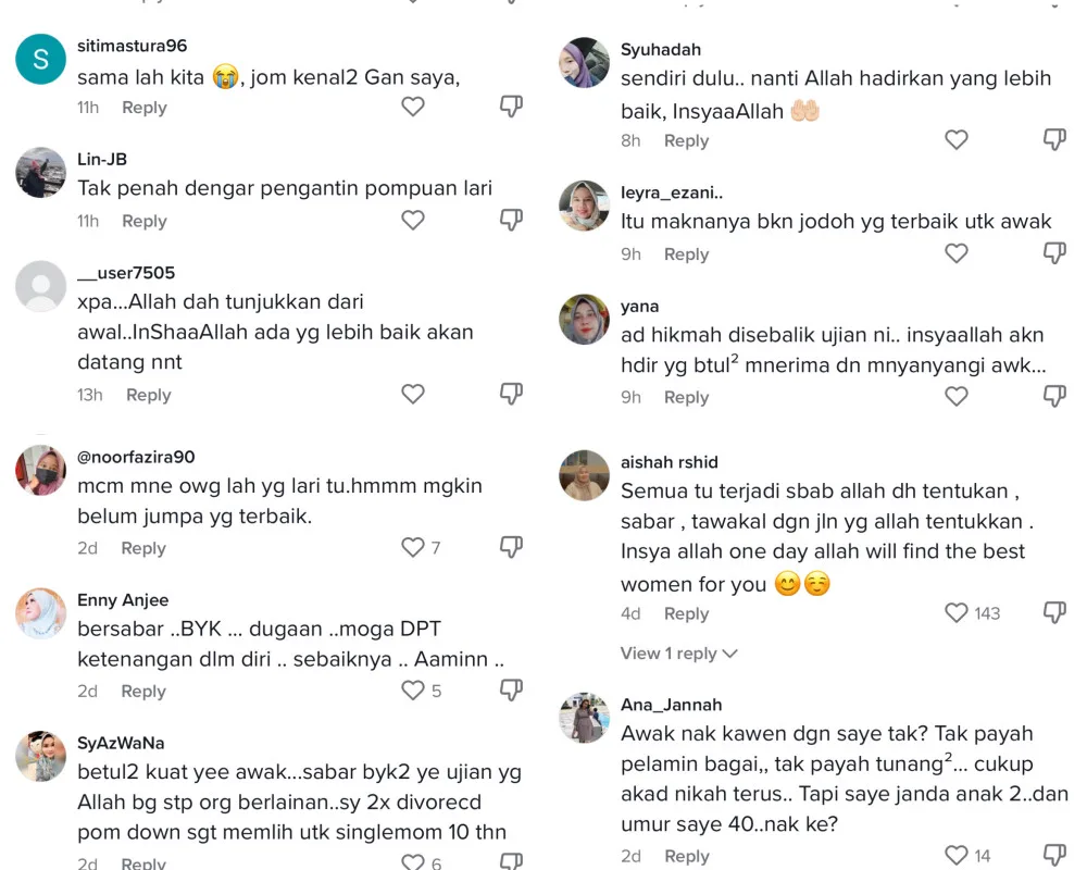 Scrolling through the TikTok comments, we found that many of the commenters are women. Most display sympathy and said that Kerol should be patient, and that the right one will come along one day. Some even showed empathy – telling divorced stories of their own. Surprisingly, there are even a few comments asking the man to marry them instead!