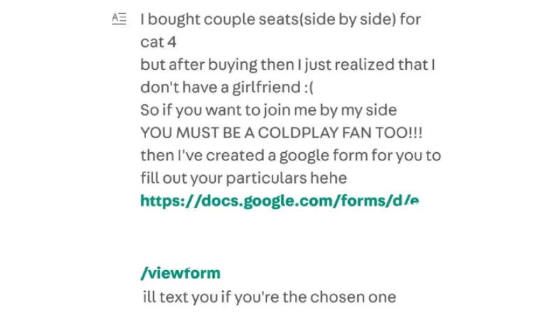 Carousell user @wecoolliekdat posted an advertisement on the app’s community page saying that he’s currently in search of a date to go watch Coldplay’s “Music of the Spheres” concert in November. According to the ad posted, the man apparently bought CAT 4 couple’s seat tickets but then he realised that he doesn’t have a girlfriend to enjoy the show with. (Yes, that’s a little suss if you ask us.)