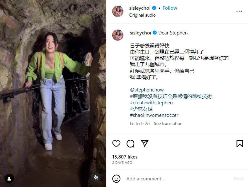 Sisley also spoke to Stephen Chow in her caption of her video, saying: “Dear Stephen, the days go by so fast. It has been three weeks since your birthday. (I might) be late but I was thinking of you every moment of the whole trip. I (have) walked nine cities, visited martial arts masters of all walks of life and trained myself. I’m ready.”