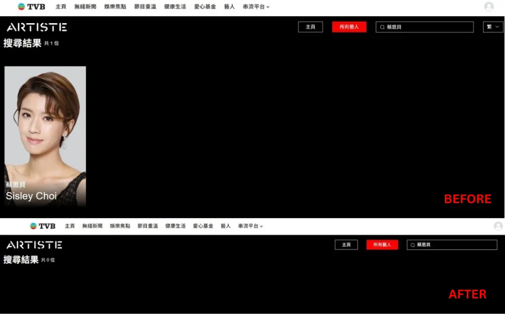 While Sisley has yet to address the rumours, netizens recently discovered one detail that adds fuel to the allegations. According to reports, a search on the TVB website for Sisley’s name in the “Artiste” section yielded no results, suggesting that TVB has removed her profile. This revelation is yet another indication that Sisley has left her long-time management.