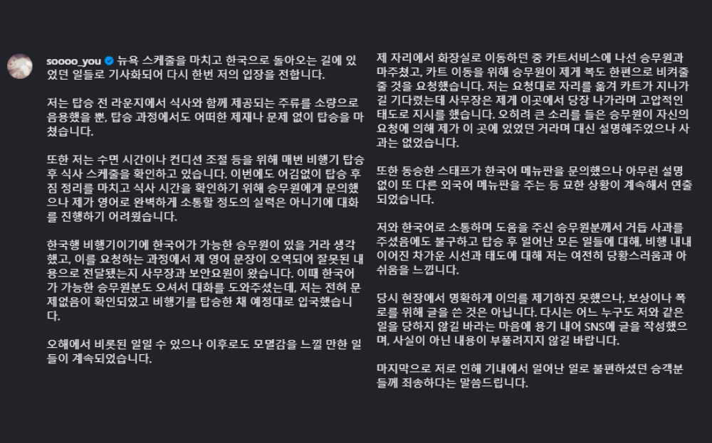 However, the singer said things worsened later in the flight. “When I stood aside to let a cart pass, the purser shouted, ‘Get out of here immediately!’ Even though another attendant explained it was a misunderstanding, no apology was made. I felt humiliated,” Soyou recalled.