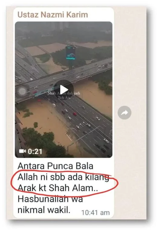 A screenshot of a text message from a certain WhatsApp group has gone viral recently on social media. A Muslim scholar known as Ustaz Nazmi Karim, had sent a video of one of the highways in Section 13, Shah Alam, being flooded by murky waters during the recent disaster. With the video, he stated, “One of the reasons for this disaster is because there are alcohol factories in Shah Alam.”