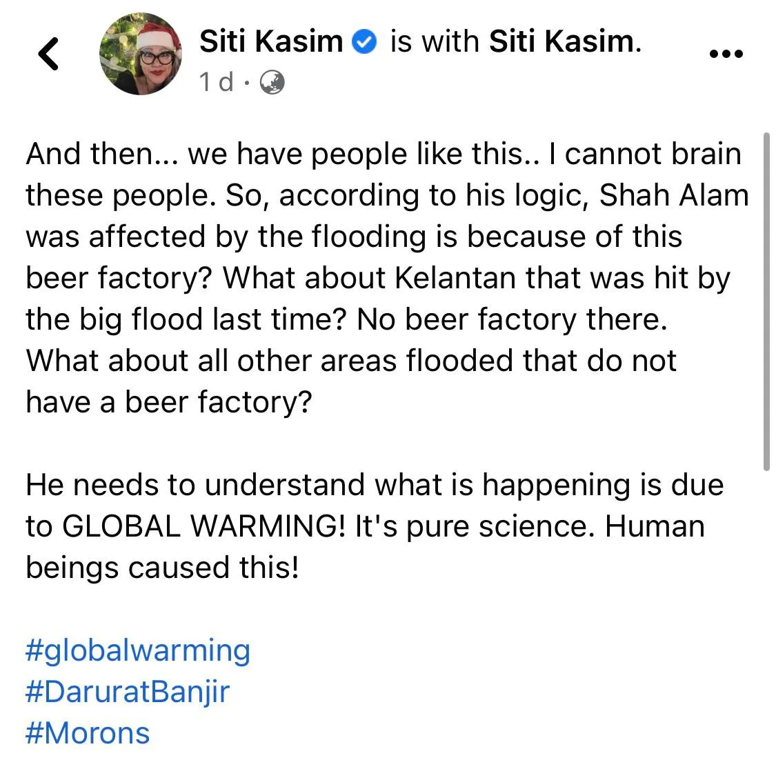 Siti Kassim was baffled by this man’s statement and spoke out. Besides bringing awareness on global warming and educating the public on our collective responsibility, she also questioned his logic. “What about Kelantan that was hit by the big flood last time? No beer factory there. What about all other areas flooded that do not have a beer factory?” she asked.