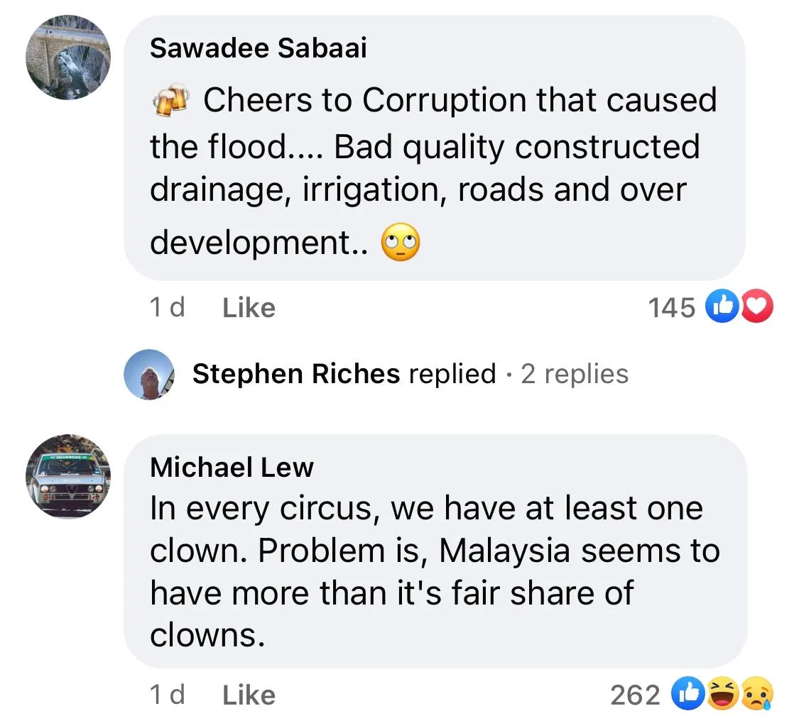 Netizens were astonished by this issue as well, and they too, decided to chip their piece of mind. Most of the replies to this issues were sarcastically hilarious. One netizen said, “Cheers to corruption that caused the flood,” then proceeded to list down all things involved in corruption. While another commented on how there are more clowns than we actually need in Malaysia.