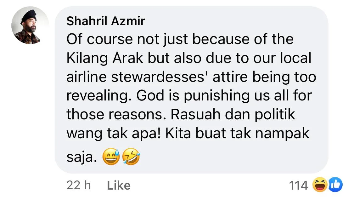 Another comment mentioned how they were surprised that the LGBTQIA+ community was dragged into the blaming game as well. Someone named Shahril Azmir even “blamed” the local airlines’ stewardesses for revealing their attires at God and that’s why his wrath is upon on us. “Briberies and money politics are okay! We’re going to turn a blind eye to that,” he mocked.